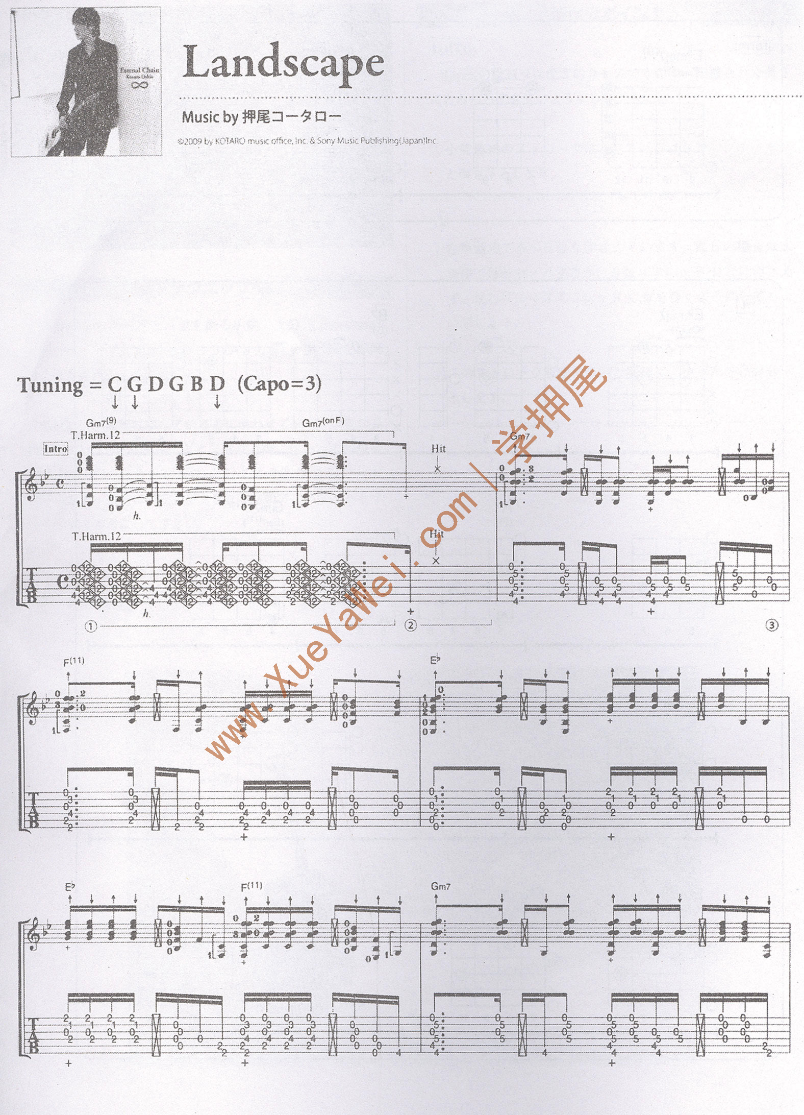 看到网上有朋友在找押尾光太郎,Eternal Chain专辑指弹曲目Land Scape的原版高清吉他谱,现上传共享给大家,希望对大家学习押尾桑吉他指弹有所帮助,同时也希望大家能够继续关注 学押尾|www.XueYaWei.com 网站,谢谢!