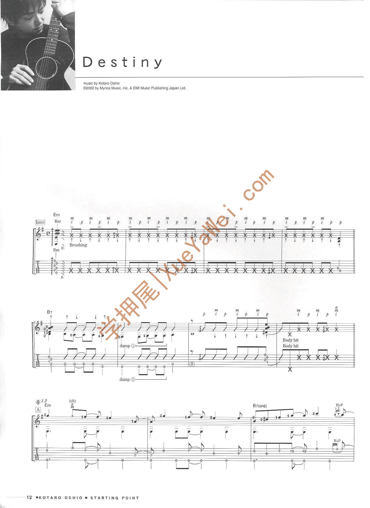 看到网上有人在找押尾光太郎2003年演奏会中的Destiny/命运 这首吉他曲的吉他谱,这首曲子是押尾光太郎Starting Point专辑中的第二首曲子,该曲为Standard/标准调弦[EADGBE],现将该曲目的原版高清吉他谱上传给大家共同学习,希望对大家有所帮助。