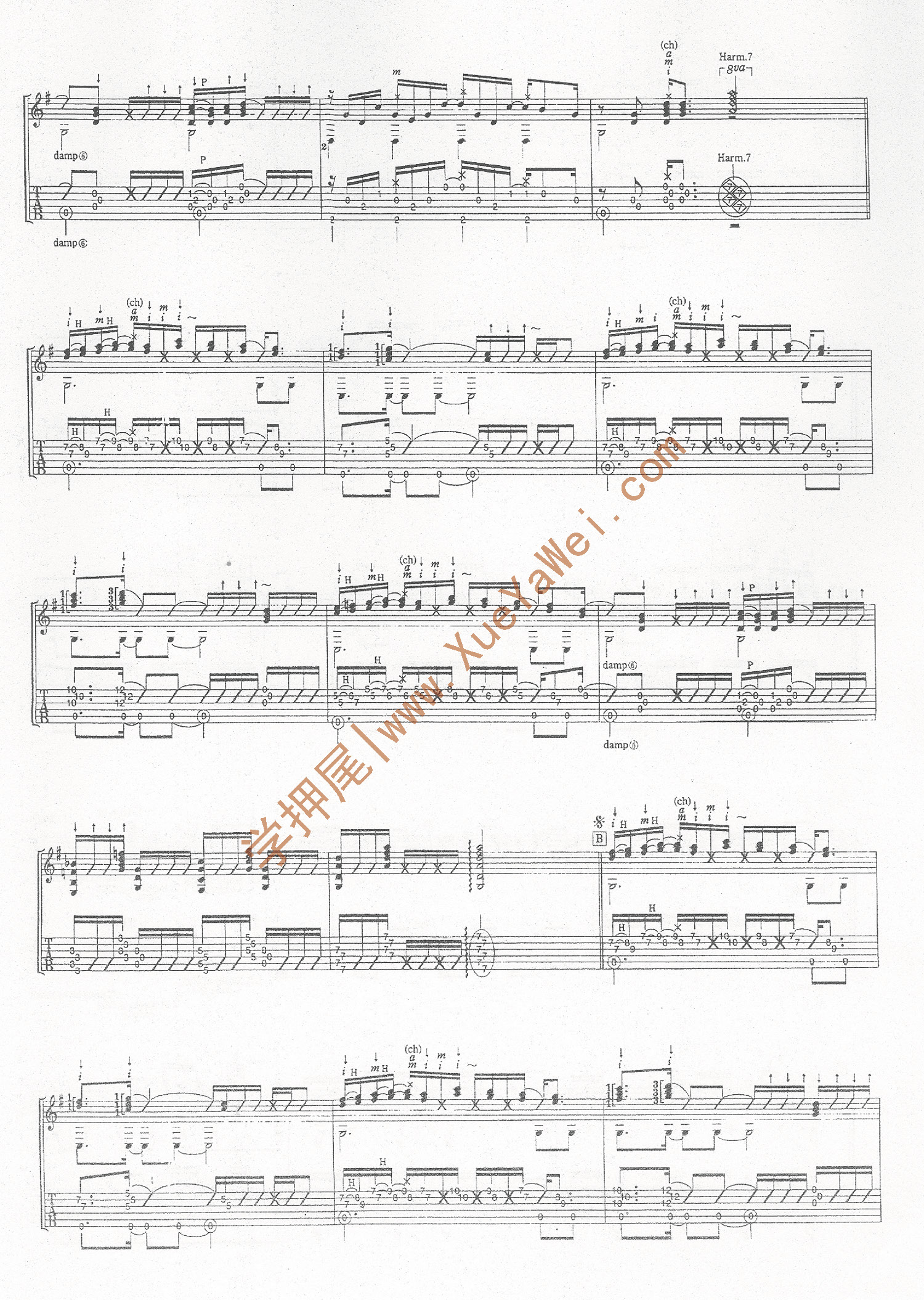 调弦方式:CGDGBD(6弦降2个全音,5弦降1个全音,3、4弦不调,2弦为标准音,1弦降1个全音)